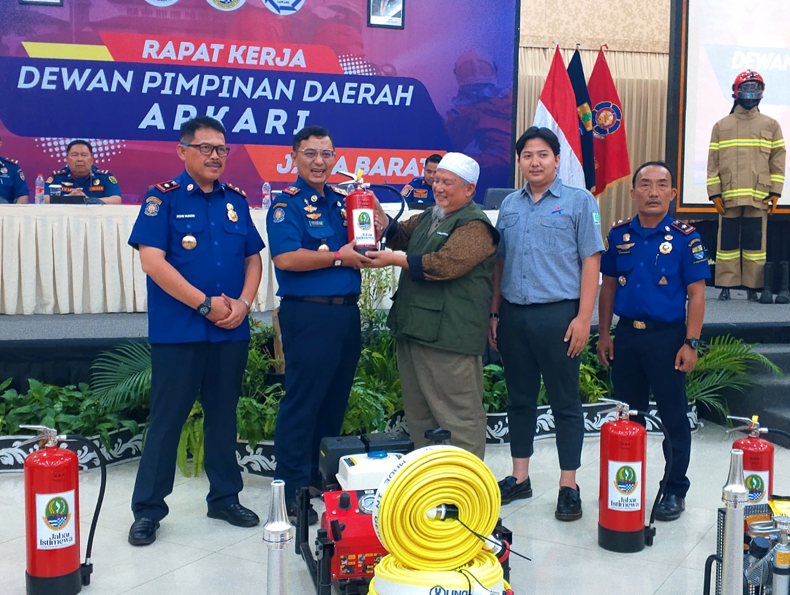 Pada rapat kerja kemarin, DPD APKARI Jawa Barat menyerahkan 100 tabung Alat Pemadam Kebakaran Ringan (APAR), dari Gubernur Jawa Barat untuk masyarakat Jawa Barat yang membutuhkan. (sep)
