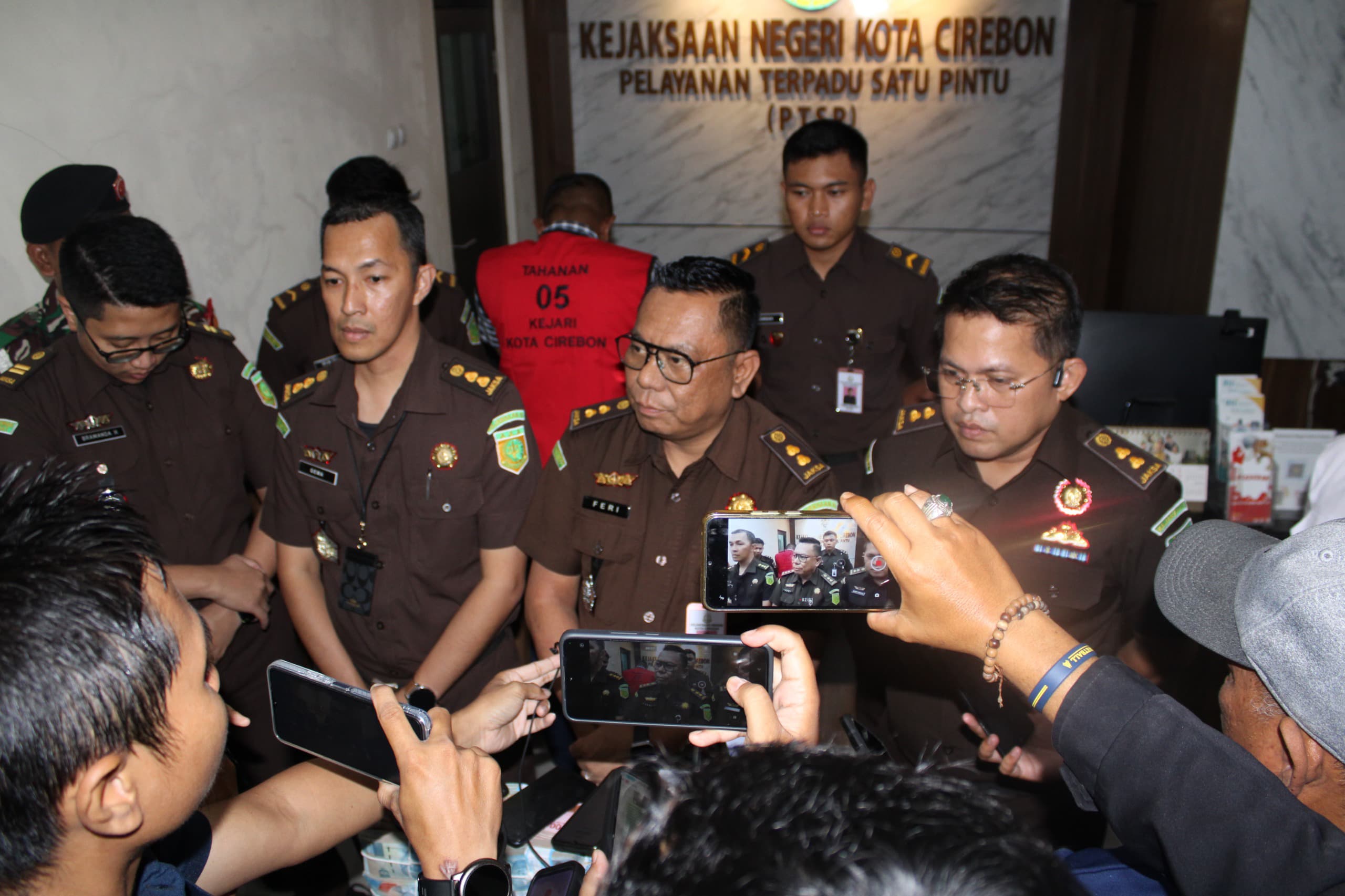 Mengenakan rompi tahanan merah bernomor 05, RN digiring masuk ke mobil tahanan usai konferensi pers. Saat Rakyat Cirebon menyakan peran RN di kasus PIP SMA Negeri 7 Cirebon kepada Ketua Tim Penyidik Kejari Kota Cirebon, Gema mengungkapkan, RN bukan bagian dari partai politik manapun.